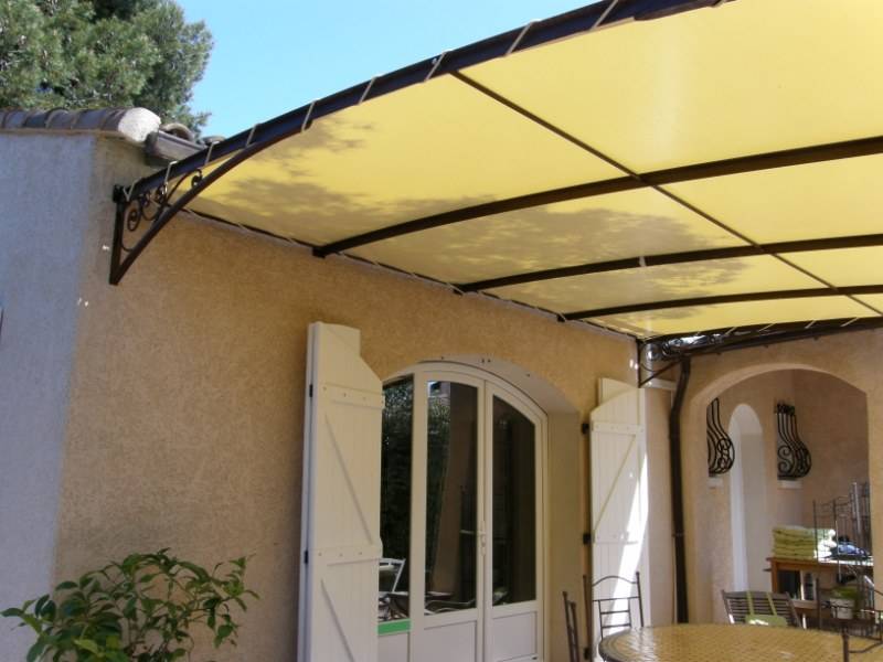 Voici une pergola adossée à un mur, 5m x 5m rouillée et vernie avec bache pvc beige. Cet ouvrage a été fabriqué dans mon atelier de métallerie à Monétay sur Allier et livrée à Montluçon, en kit à boulonner.