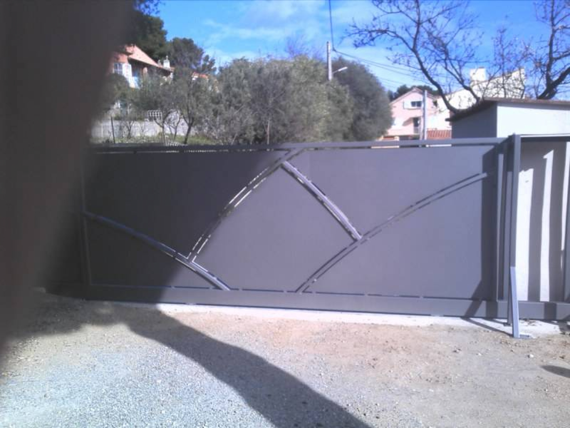 Art Métaux vous propose la fabrication d'un portail coulissant design acier thermolaqué. Grande longueur = 6m x 2m. Je peux vous proposer la pose dans l'Allier et ses environs. Ce portail a été posé par mes soins dans la région de Montluçon.